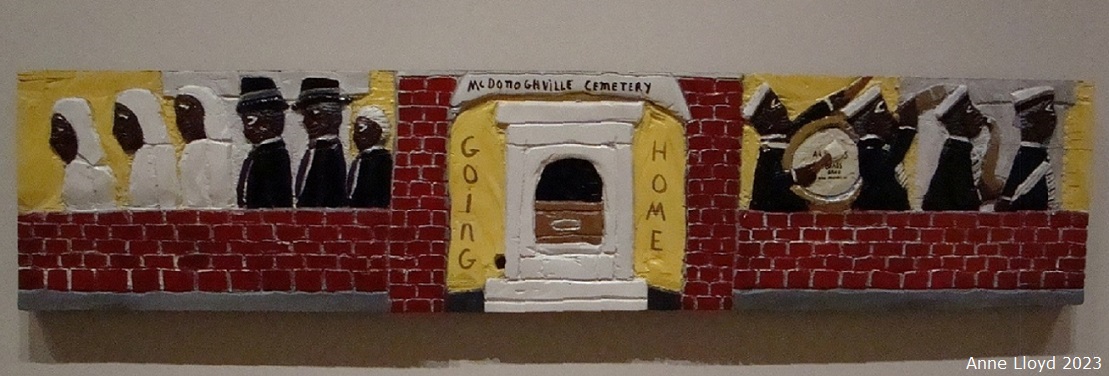 Anne Lloyd, Photo (2023) Herbert Singleton's Going Home: McDonogh Cemetery. Date unknown. Alkyd industrial paint, including metallic paint, on carved red cedar with yellow pine battens: 12 3/4 x 60 inches (32.4 x 152.4 cm) Collection of Jill and Sheldon Bonovitz.