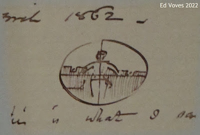 Metropolitan Museum of Art exhibit wall-text. Letter from Winslow Homer to George G. Briggs, 1896. Drawing shows Homer's view of a Confederate soldier through the telescopic sight of a sharpshooting rifle, 1862.